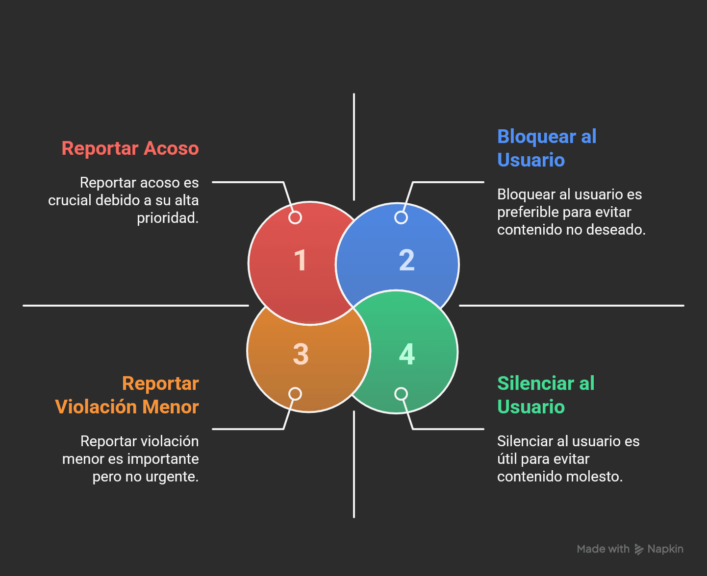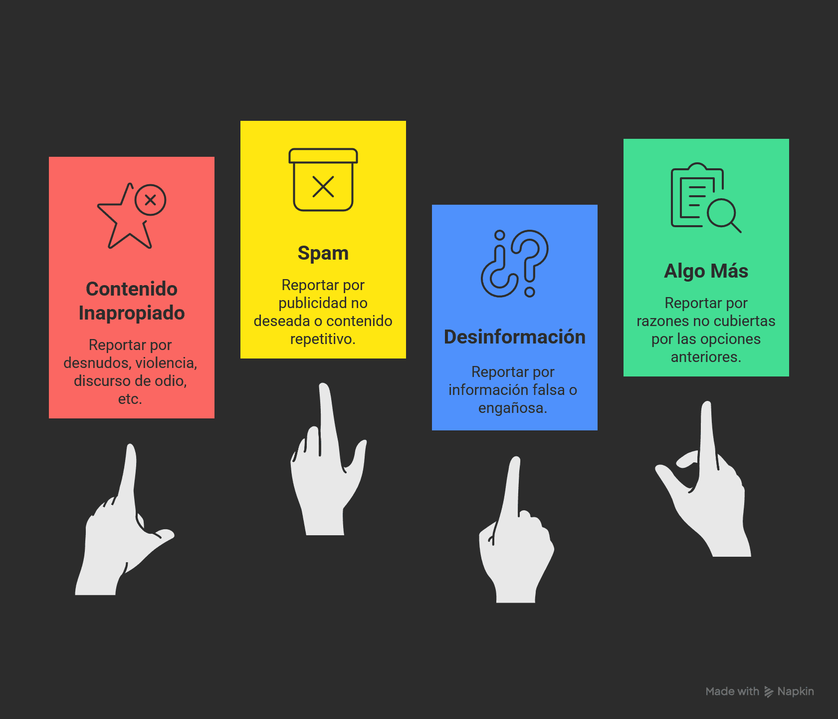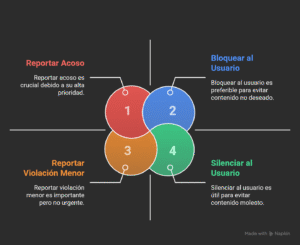 - Contenido inapropiado: Para cosas como desnudos, violencia, discurso de odio, acoso, etc.