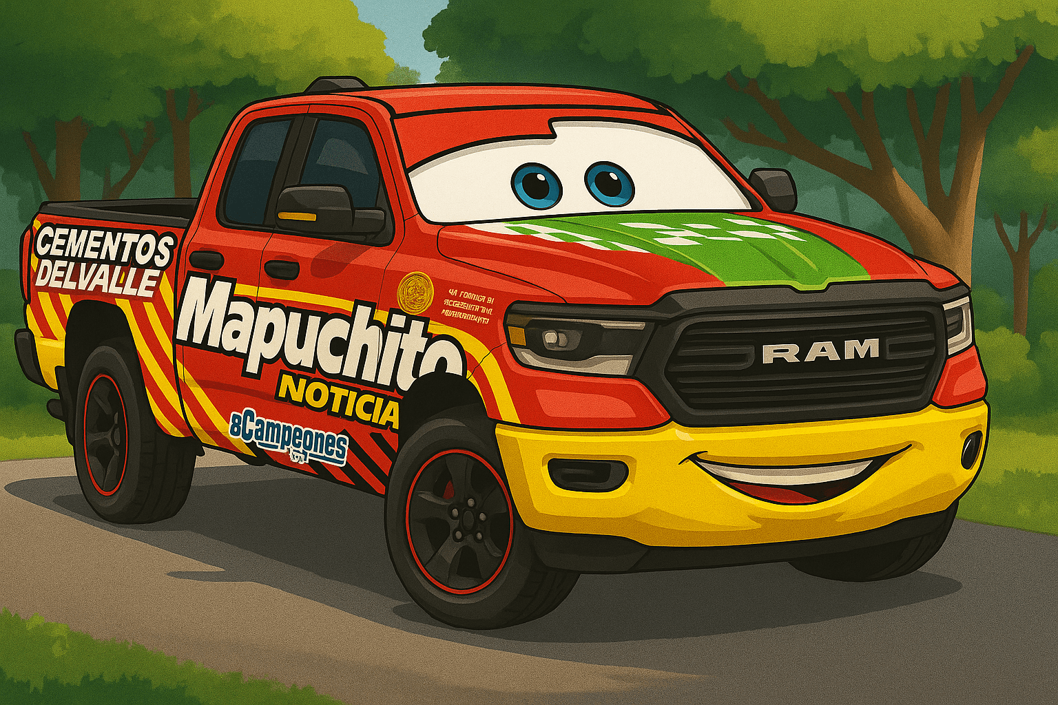 Trabajo realizado con IA, generación de caricatura a partir de la fotografia del vehículo de @MapuchitoNoticias, luego se realizó la animación y el video final, tanto con IA como con Editor para los retoques finales.